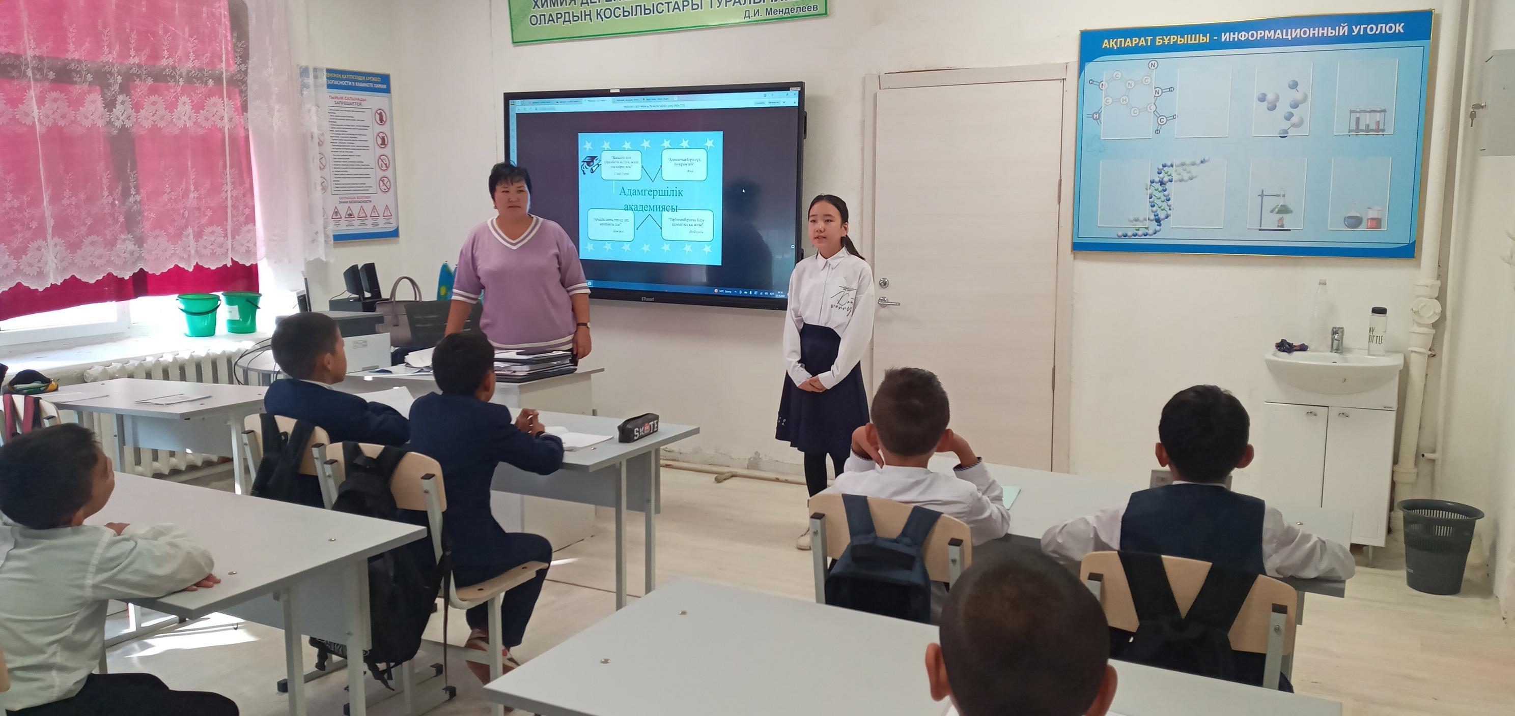 Қаракемер орта мектебінде 5 сынып оқушыларымен "Адамға адалдық не үшін қажет" тақырыбында тәрбие сағаты өткізілді. Мақсаты: Оқушыларға адам бойындағы адалдық, әділдік сезімдерін ұғындыру.